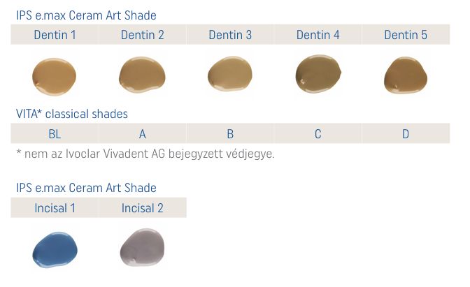 IPS e.max Ceram Art Shade A IPS e.max Ceram Art Shade paszták a kerámiarestaurációk árnyalatának módosítására használhatók, hogy azok az A–D és Bleach színskálához igazodjanak. A Shade Incisal 1 és Incisal 2 incizális anyagok, amelyek mélységet és transzlucenciát adnak a restaurációknak. Szín – A–D és BL árnyalat megfeleltetés