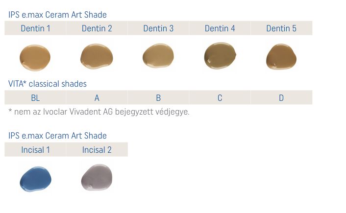 IPS e.max Ceram Art Shade A IPS e.max Ceram Art Shade paszták a kerámiarestaurációk árnyalatának módosítására használhatók, hogy azok az A–D és Bleach színskálához igazodjanak. A Shade Incisal 1 és Incisal 2 incizális anyagok, amelyek mélységet és transzlucenciát adnak a restaurációknak. Szín – A–D és BL árnyalat megfeleltetés